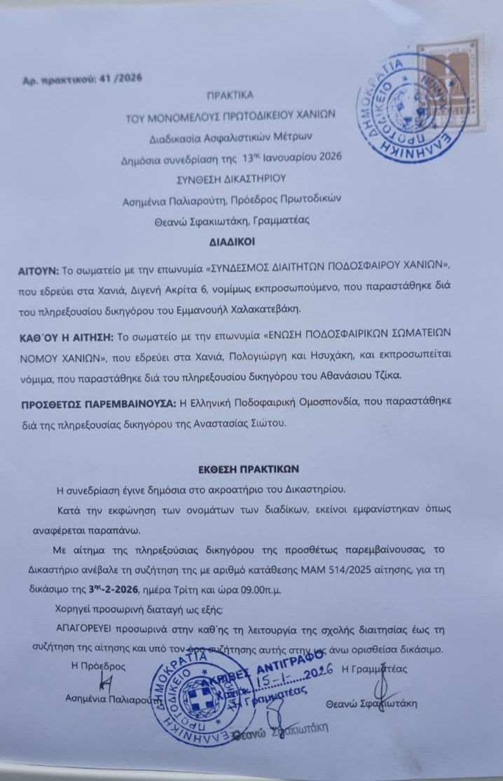 Το Μονομελές Πρωτοδικείο Χανίων έπειτα από ασφαλιστικά μέτρα που κατέθεσε ο τοπικός Σύνδεσμος Διαιτητών Ποδοσφαίρου (ΣΔΠ) κατά της Ένωσης Ποδοσφαιρικών Σωματείων Χανίων (ΕΠΣΧ), απαγόρευσε προσωρινά τη λειτουργία της σχολής διαιτησίας, έως τη συζήτηση της υπόθεση στις 3 Φεβρουαρίου 2026.